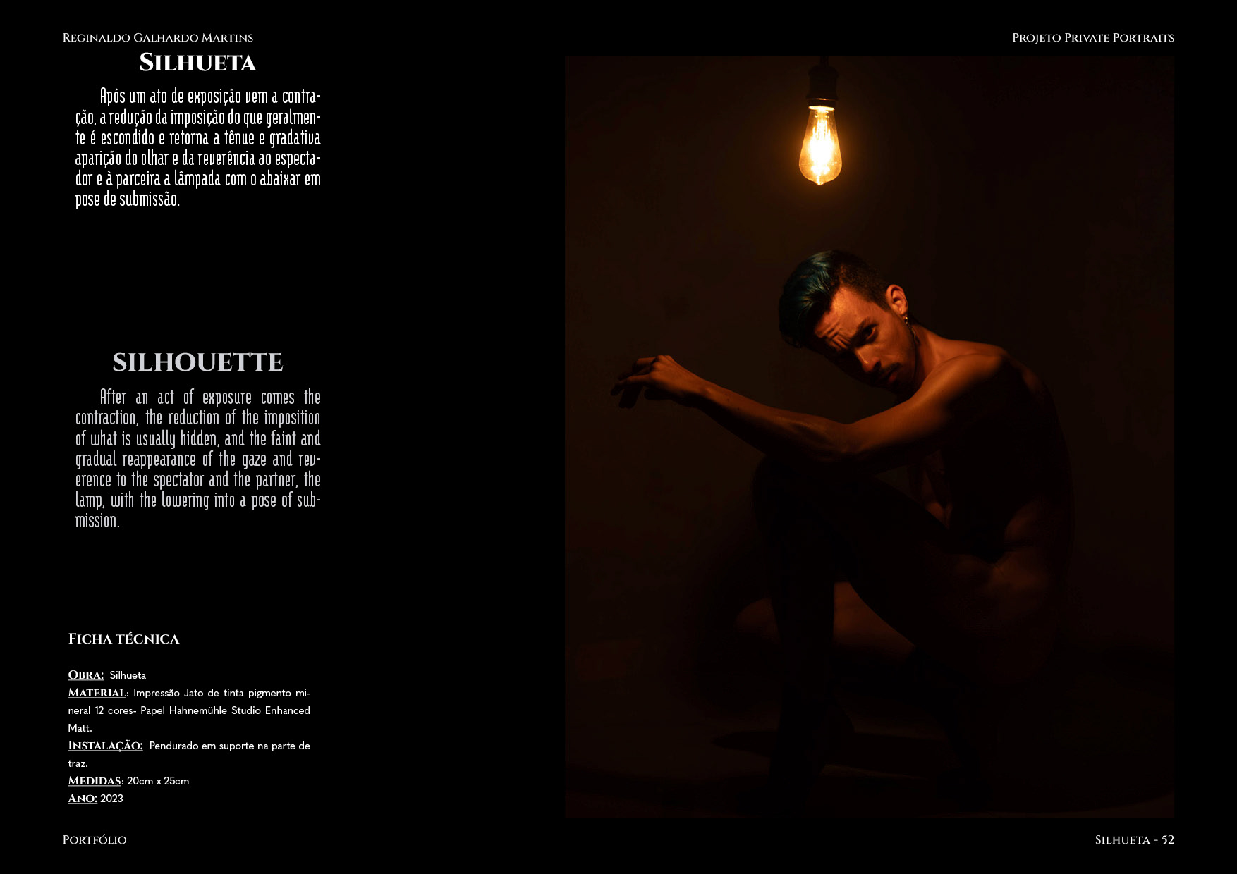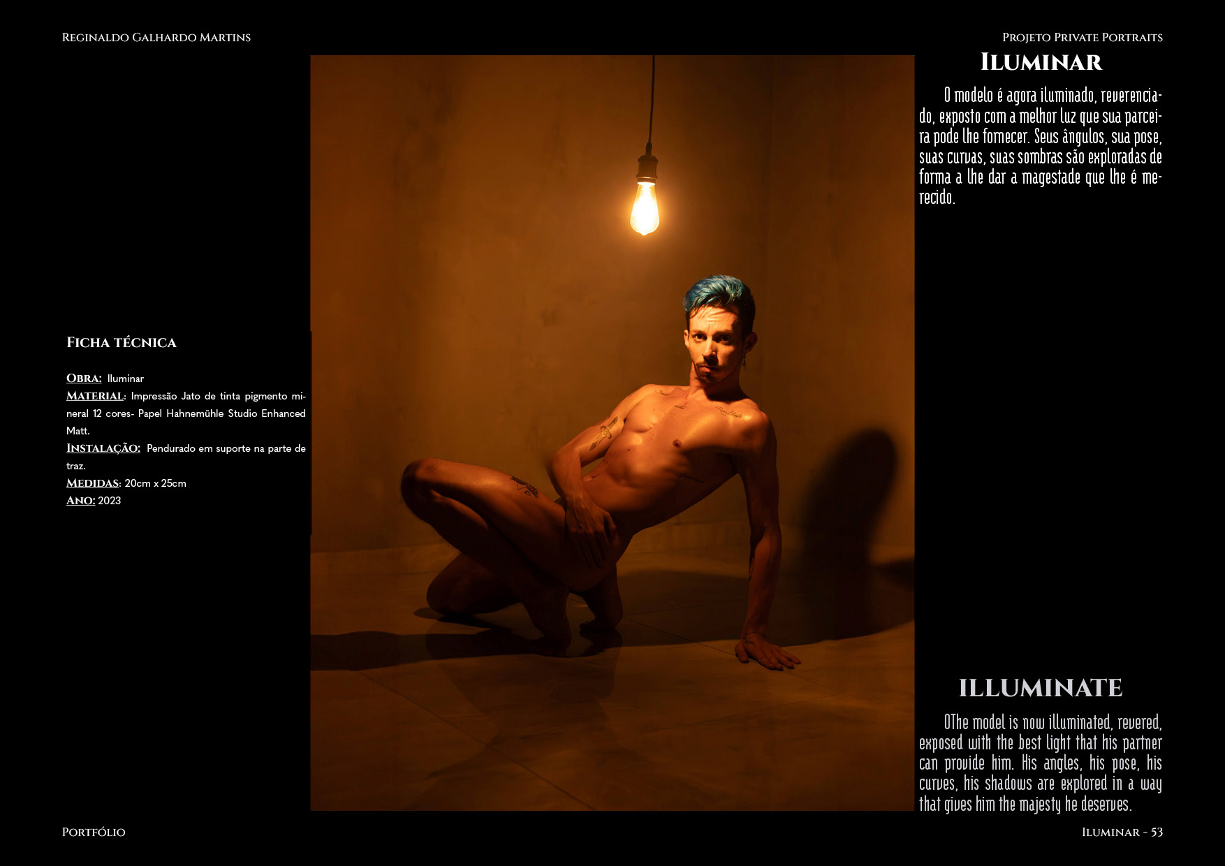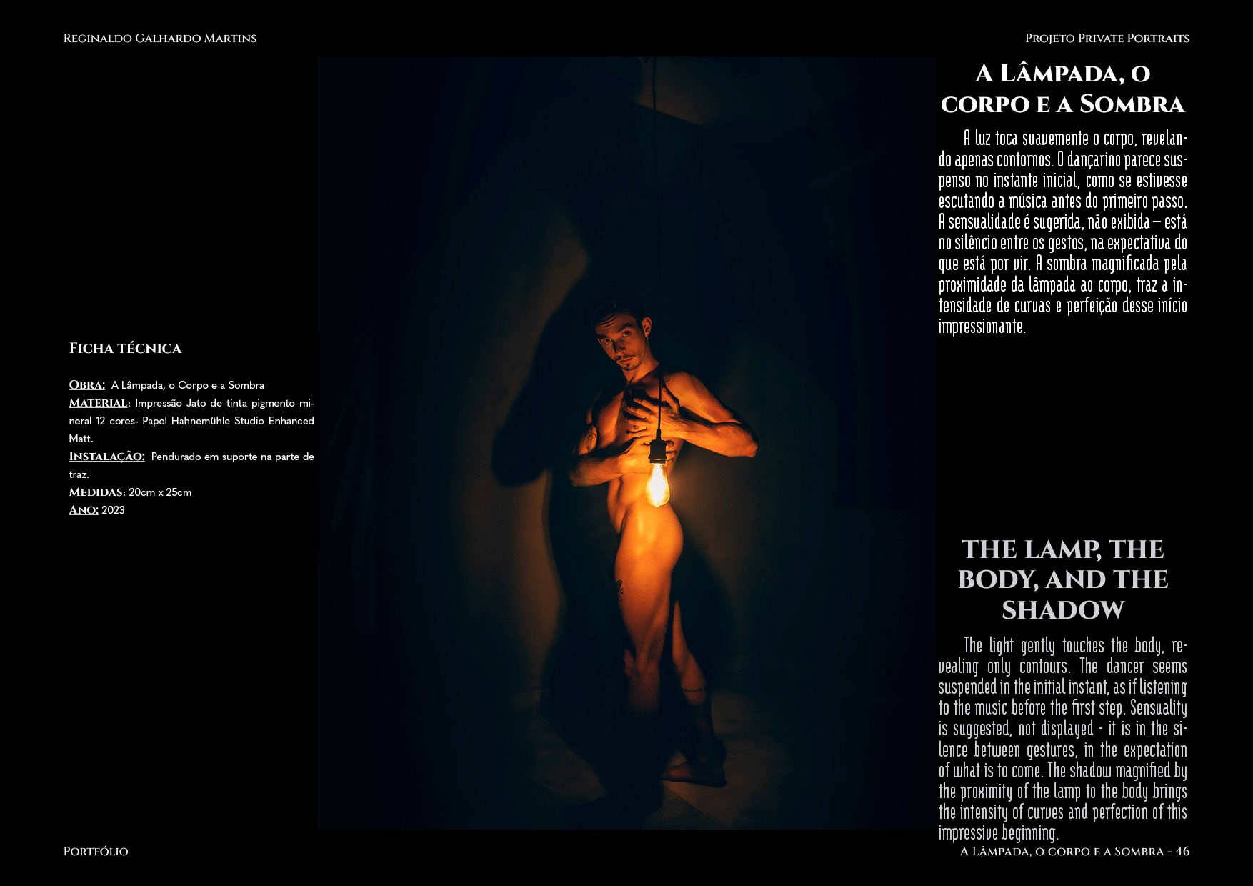 Na penumbra moldada pela luz única de uma lâmpada exposta, o corpo deixa de ser apenas matéria para tornar-se escultura viva. Cada fotografia desta série é como um ato de uma coreografia silenciosa, onde o modelo dança não para o público, mas para a própria sombra.