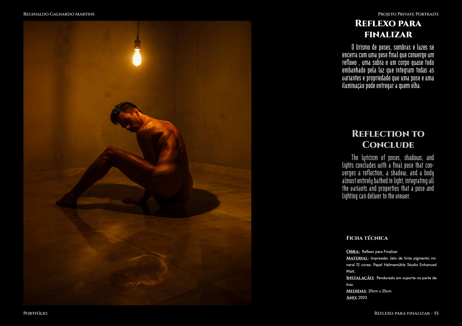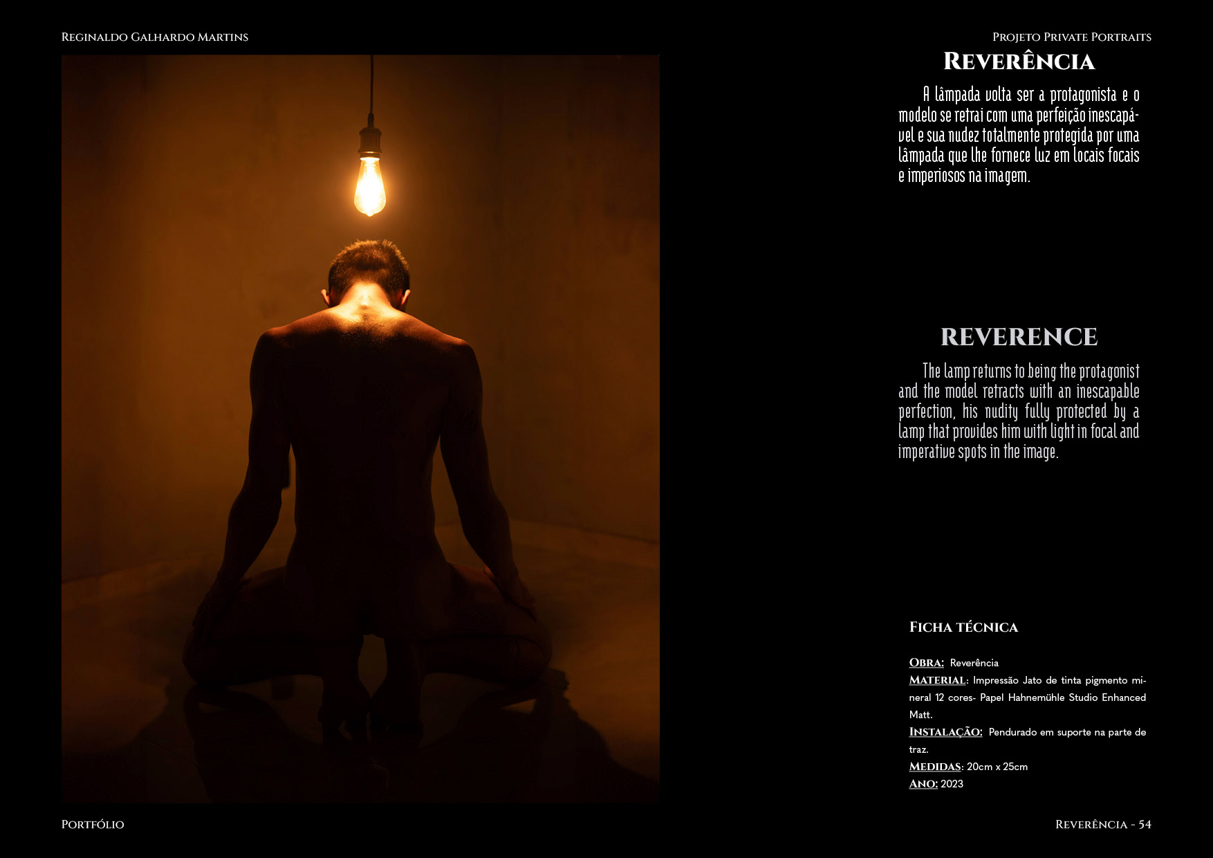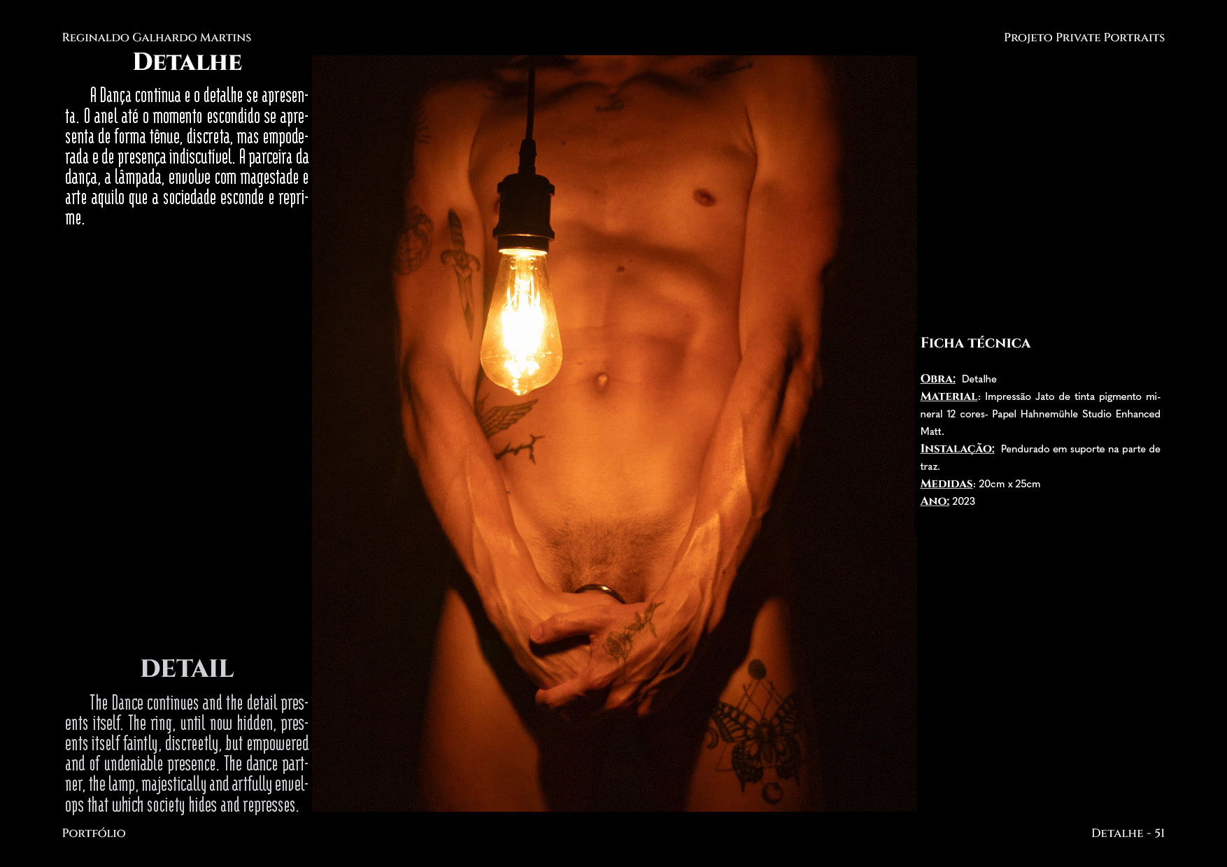 Na penumbra moldada pela luz única de uma lâmpada exposta, o corpo deixa de ser apenas matéria para tornar-se escultura viva. Cada fotografia desta série é como um ato de uma coreografia silenciosa, onde o modelo dança não para o público, mas para a própria sombra.