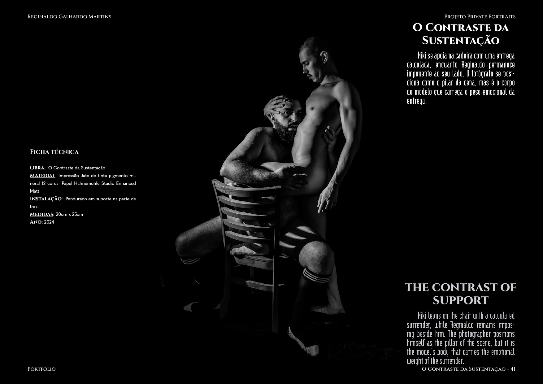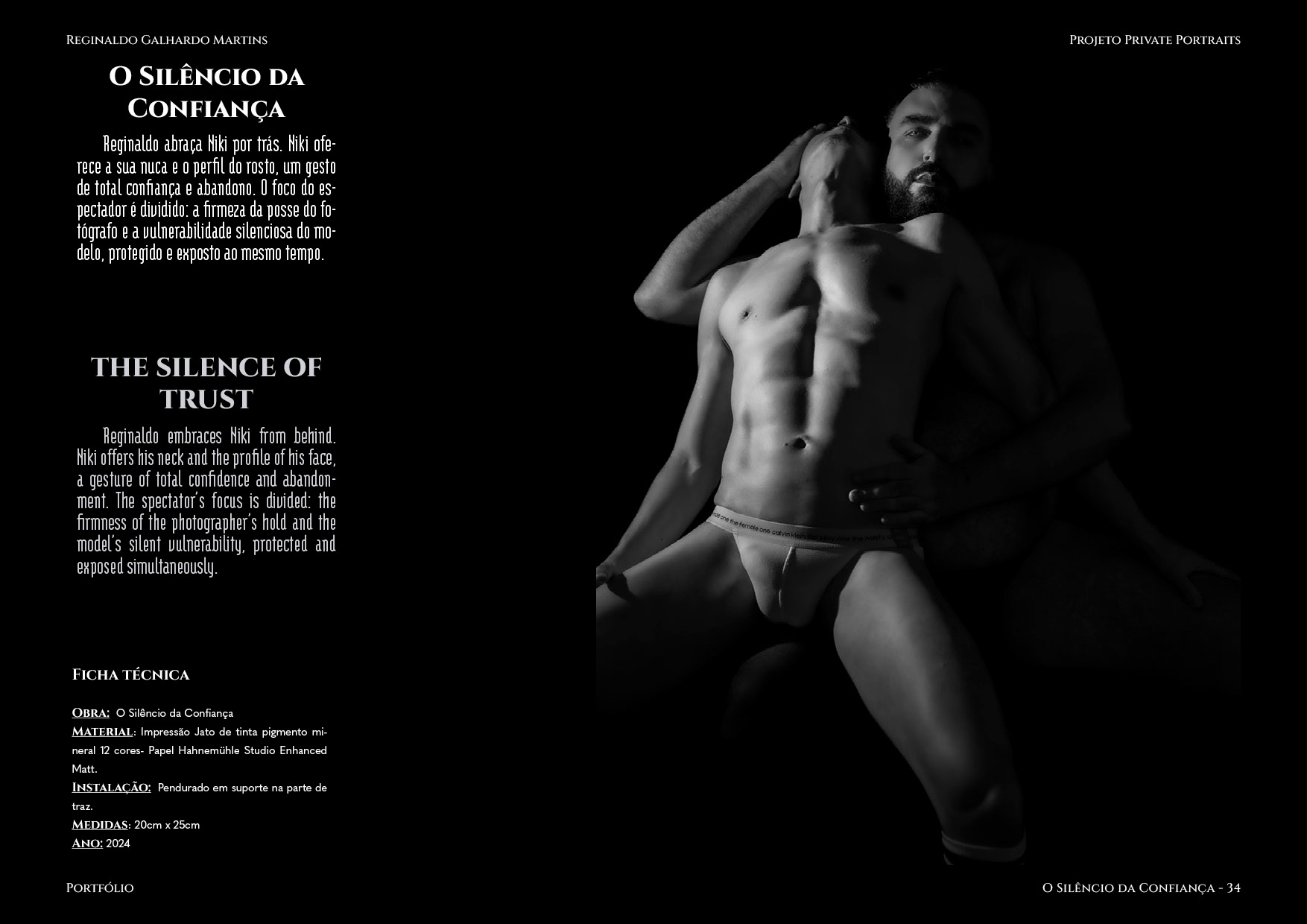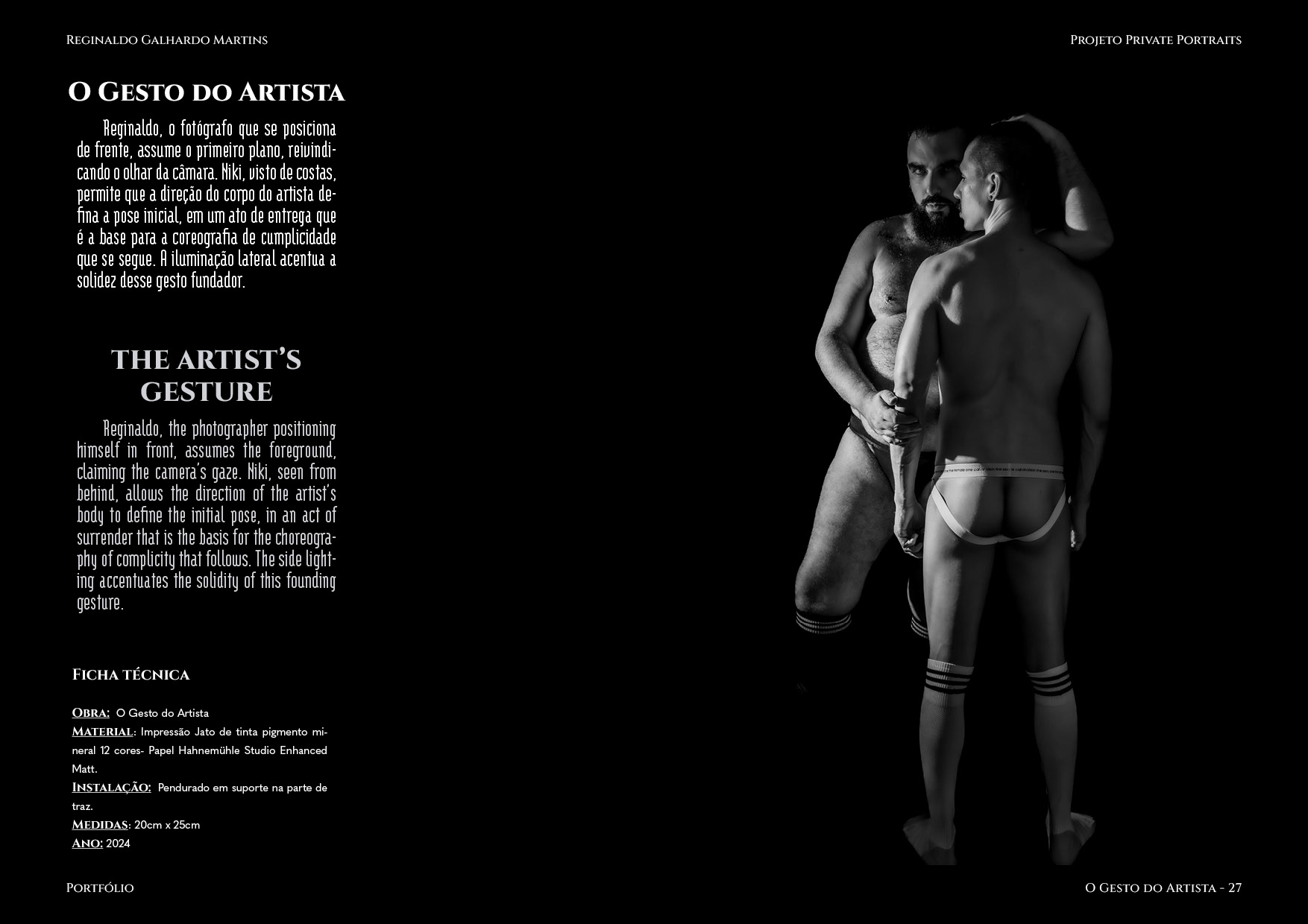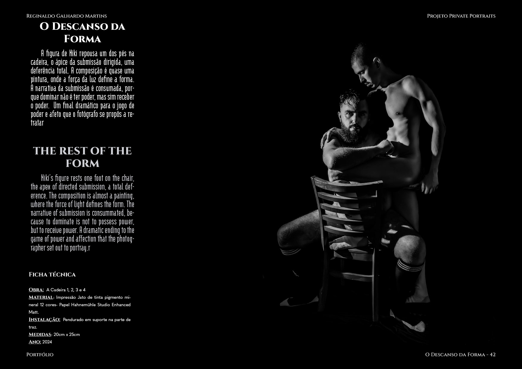 Nesta série, como fotógrafo e modelo, transformo o ato fotográfico em escultura viva. Em 18 imagens em preto e branco, dois corpos se encontram, entrelaçam-se e repousam como se fossem talhados em mármore — figuras masculinas que evocam o vigor e a delicadeza das estátuas gregas. Cada pose é um instante congelado, um gesto que oscila entre tensão e repouso, domínio e entrega, num diálogo silencioso de forças equilibradas.