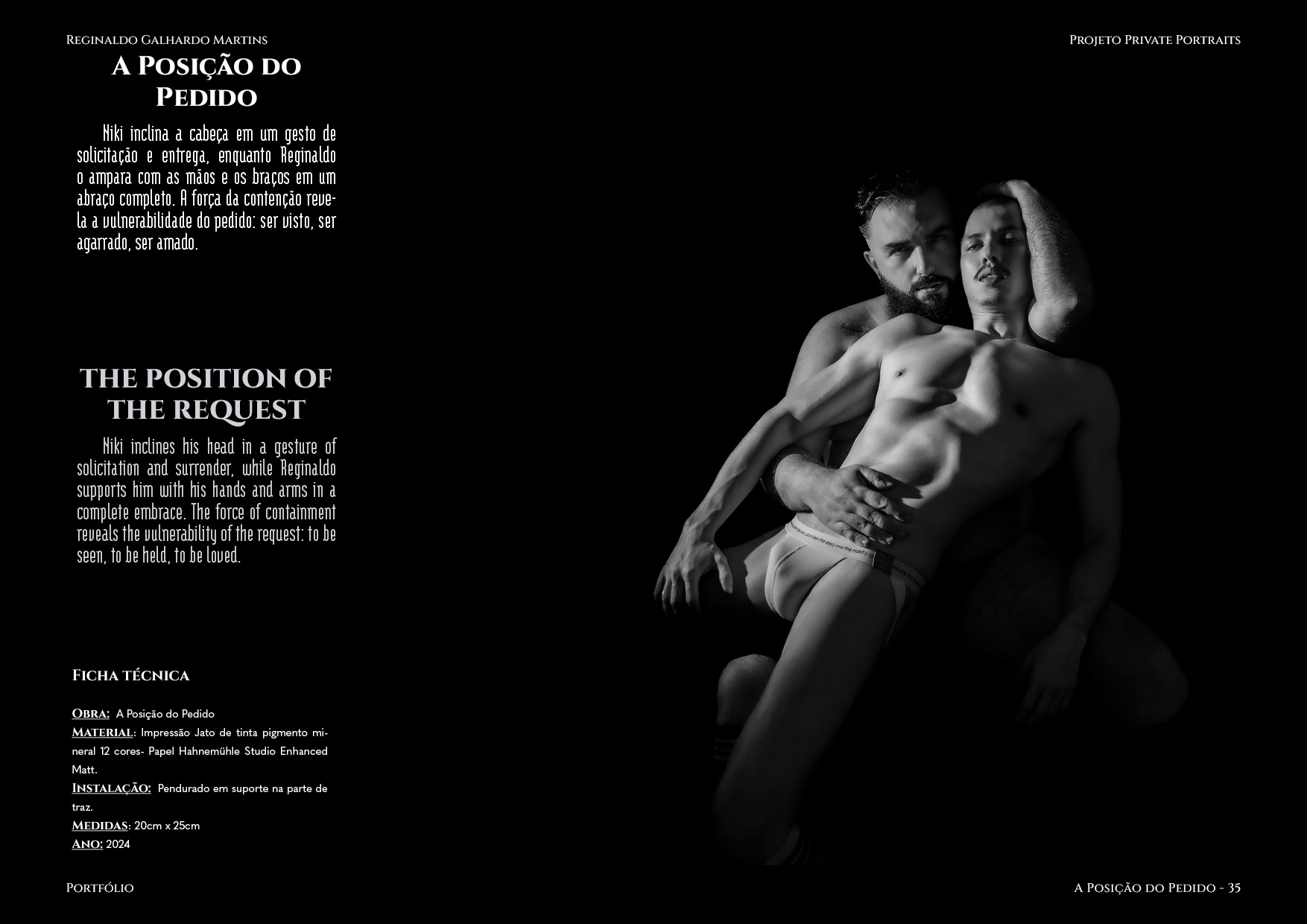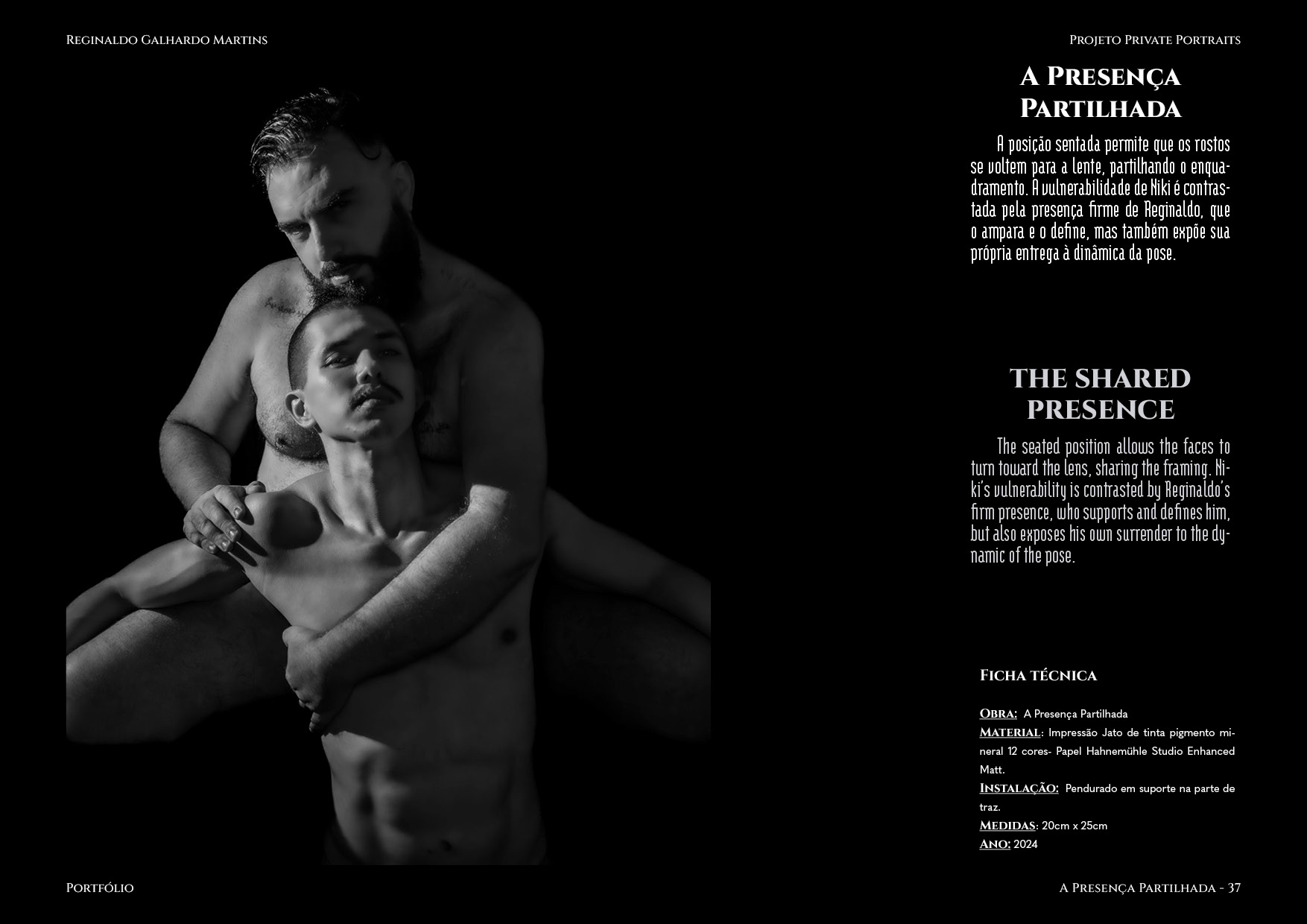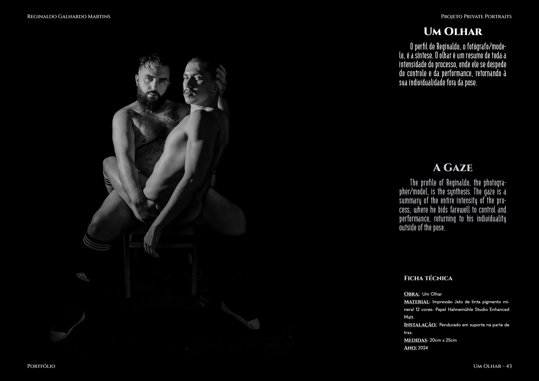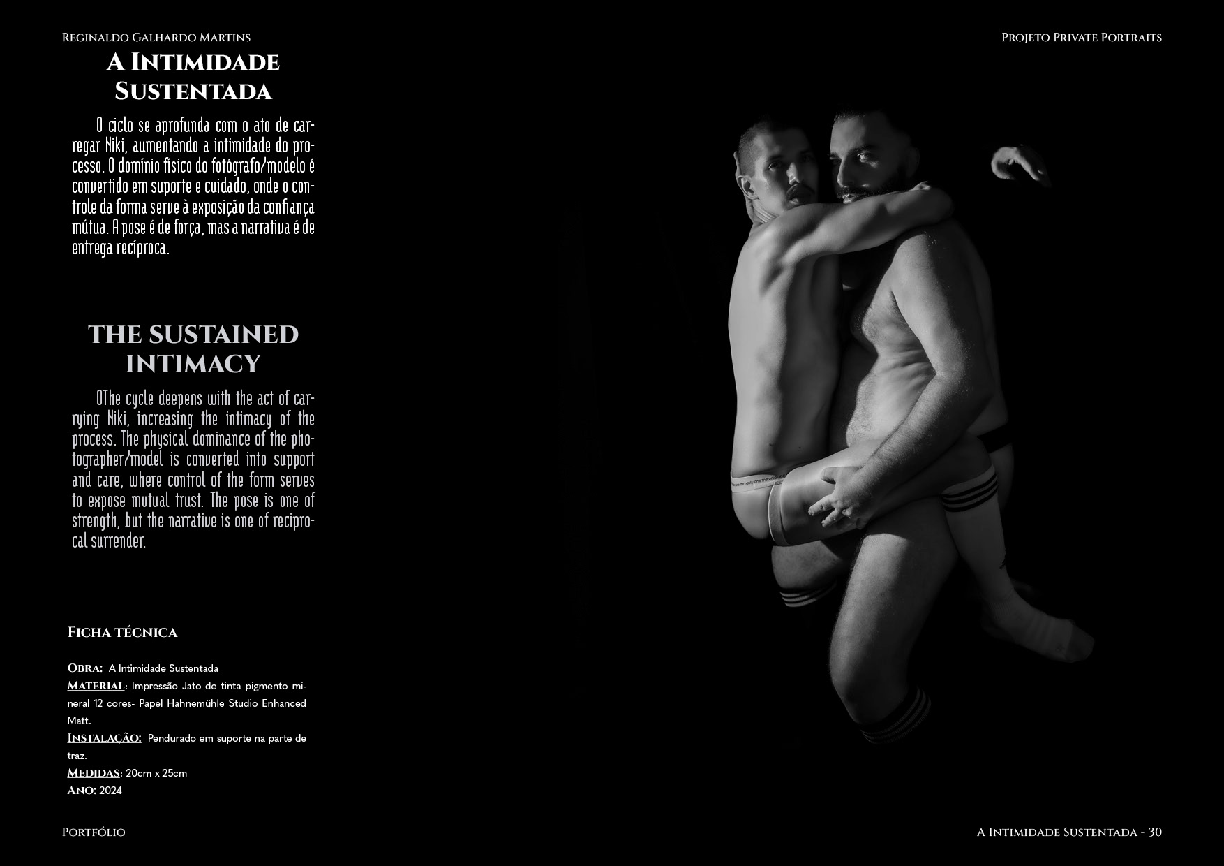 Nesta série, como fotógrafo e modelo, transformo o ato fotográfico em escultura viva. Em 18 imagens em preto e branco, dois corpos se encontram, entrelaçam-se e repousam como se fossem talhados em mármore — figuras masculinas que evocam o vigor e a delicadeza das estátuas gregas. Cada pose é um instante congelado, um gesto que oscila entre tensão e repouso, domínio e entrega, num diálogo silencioso de forças equilibradas.