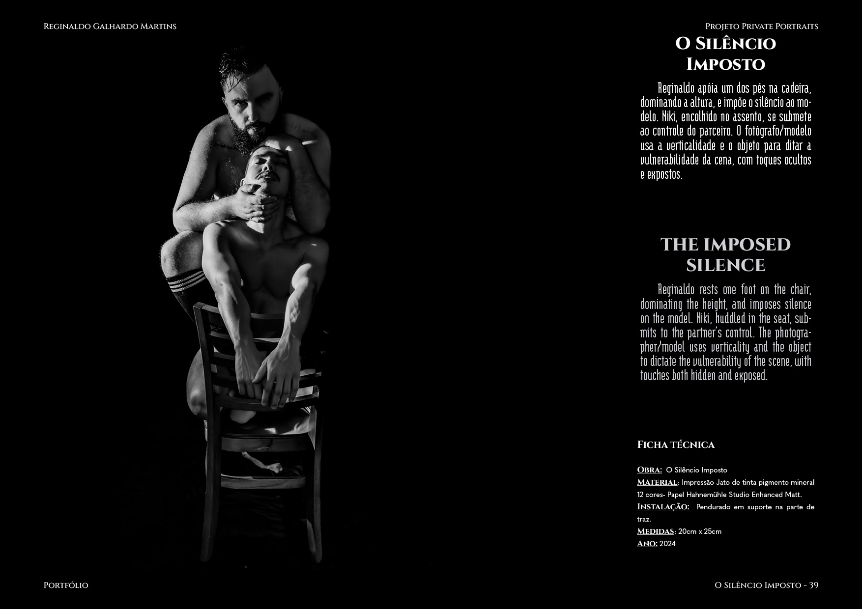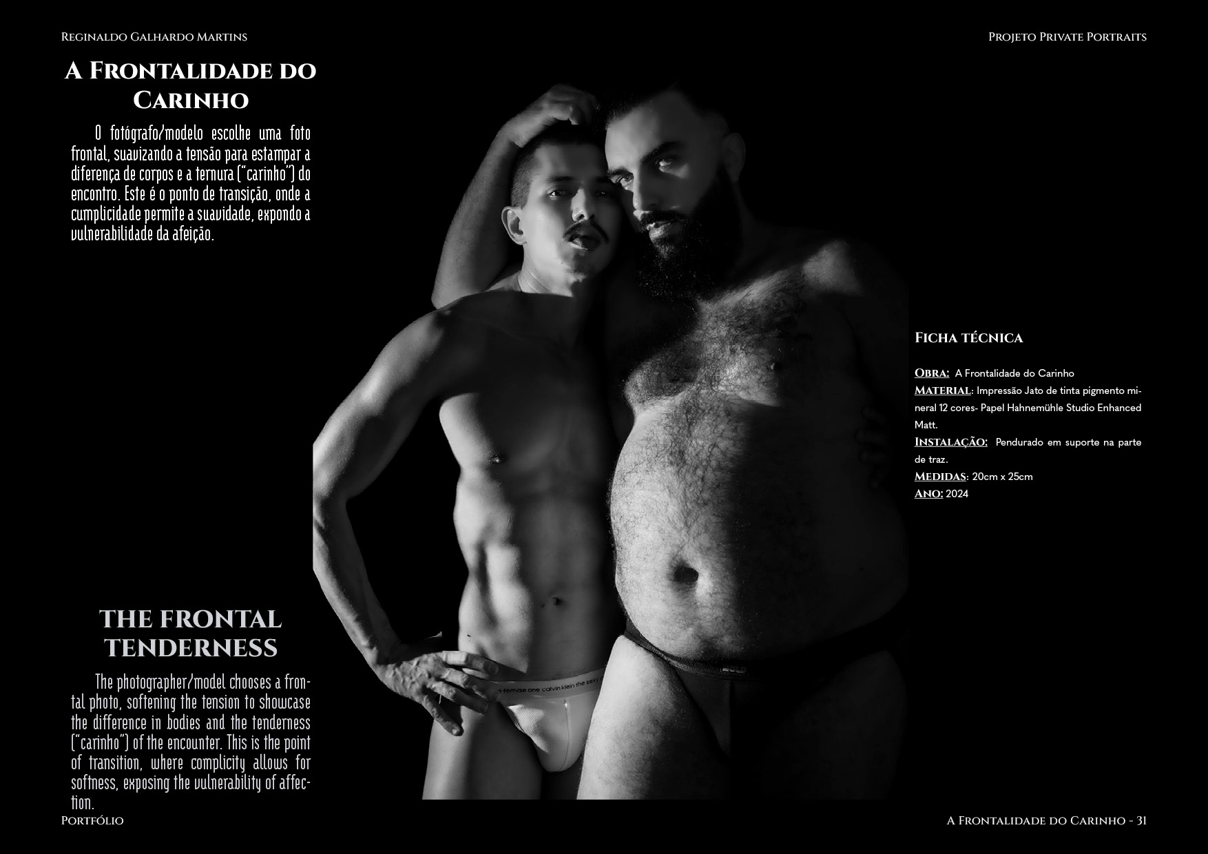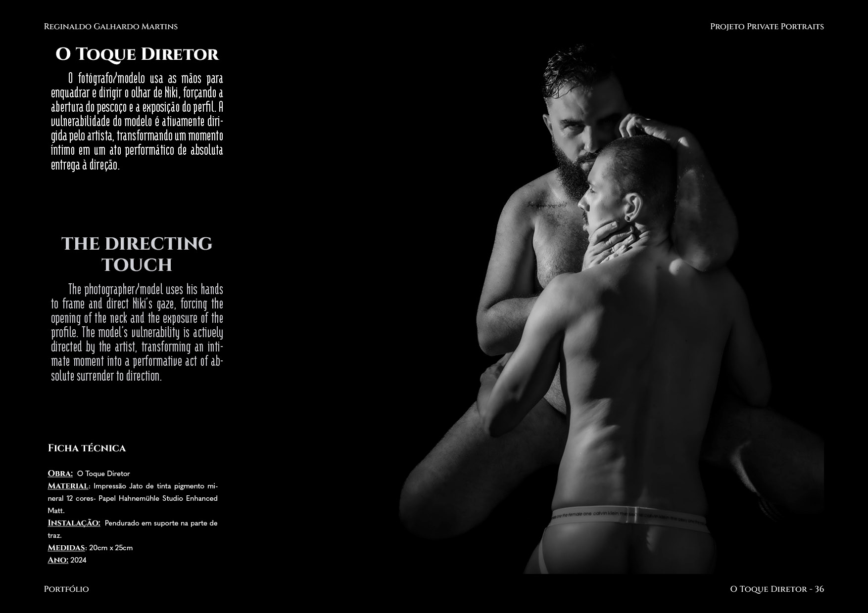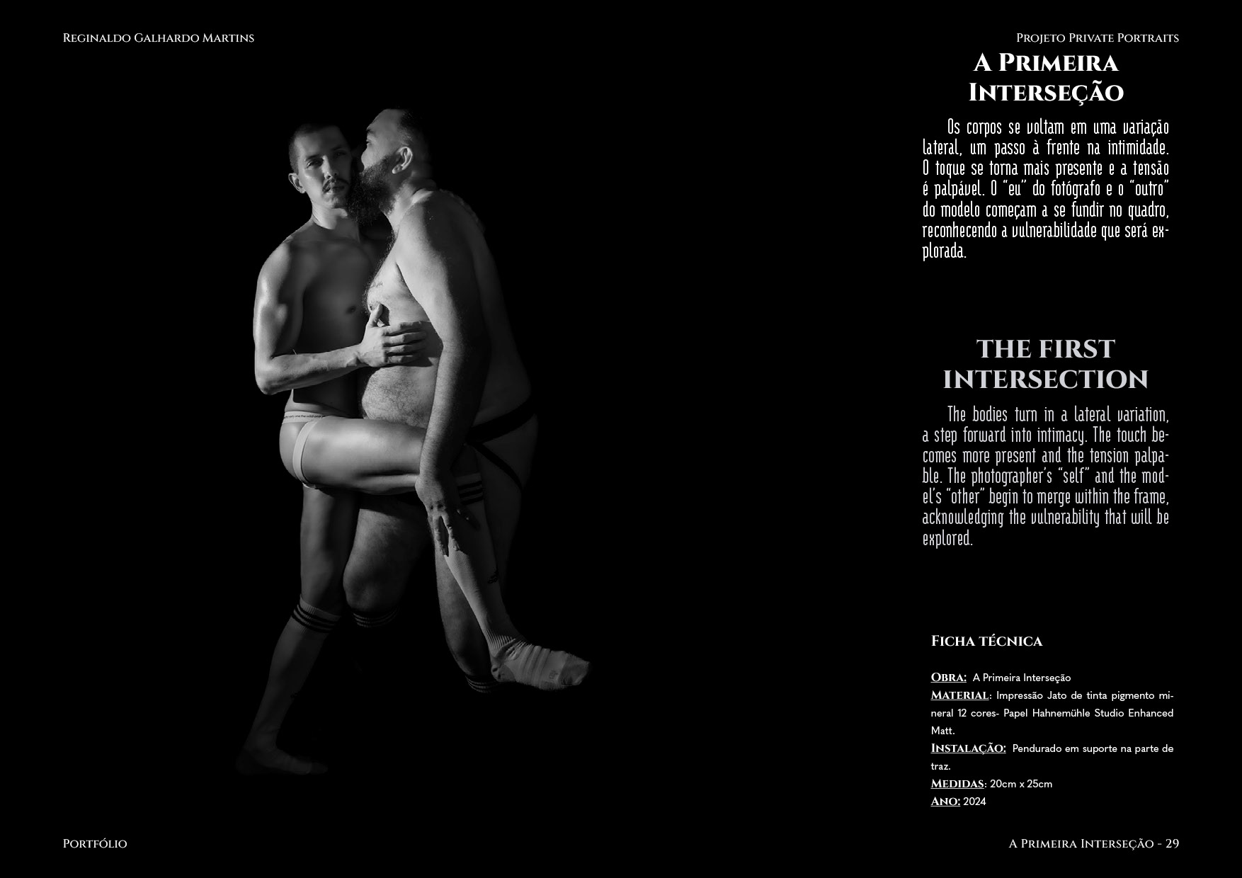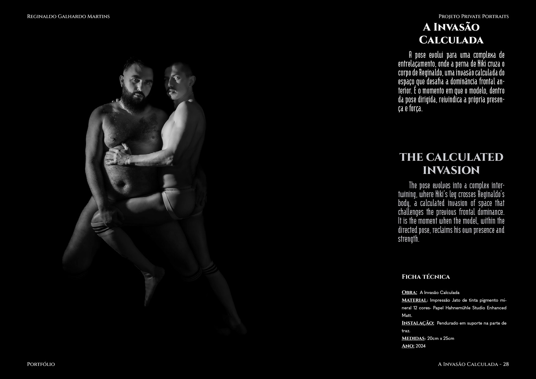 Nesta série, como fotógrafo e modelo, transformo o ato fotográfico em escultura viva. Em 18 imagens em preto e branco, dois corpos se encontram, entrelaçam-se e repousam como se fossem talhados em mármore — figuras masculinas que evocam o vigor e a delicadeza das estátuas gregas. Cada pose é um instante congelado, um gesto que oscila entre tensão e repouso, domínio e entrega, num diálogo silencioso de forças equilibradas.