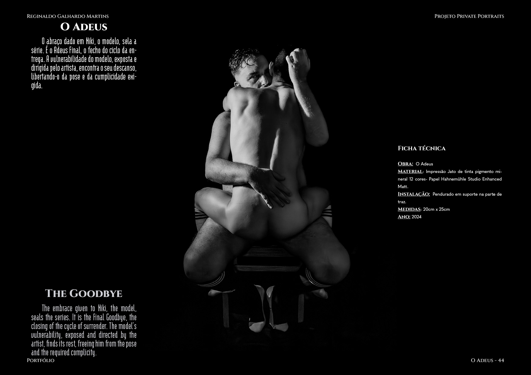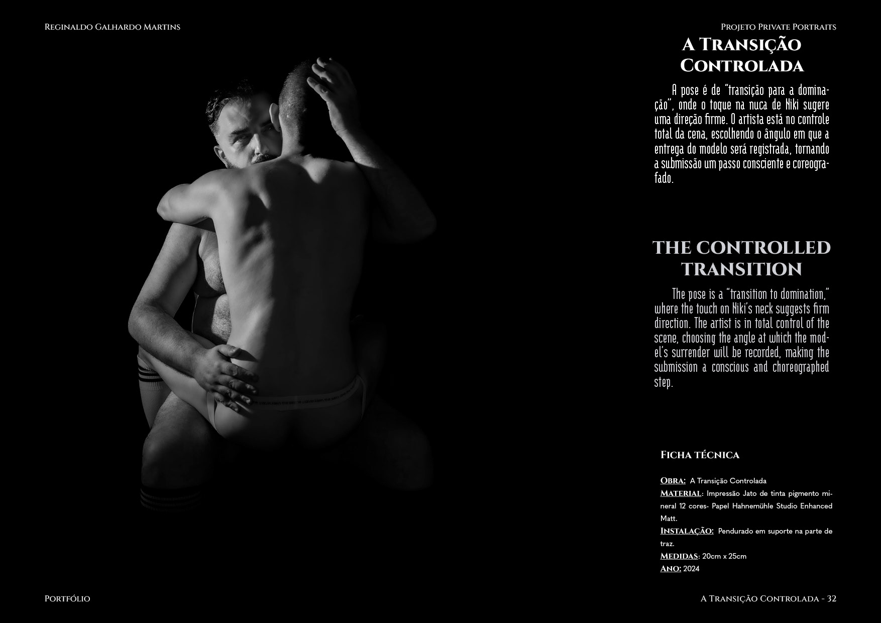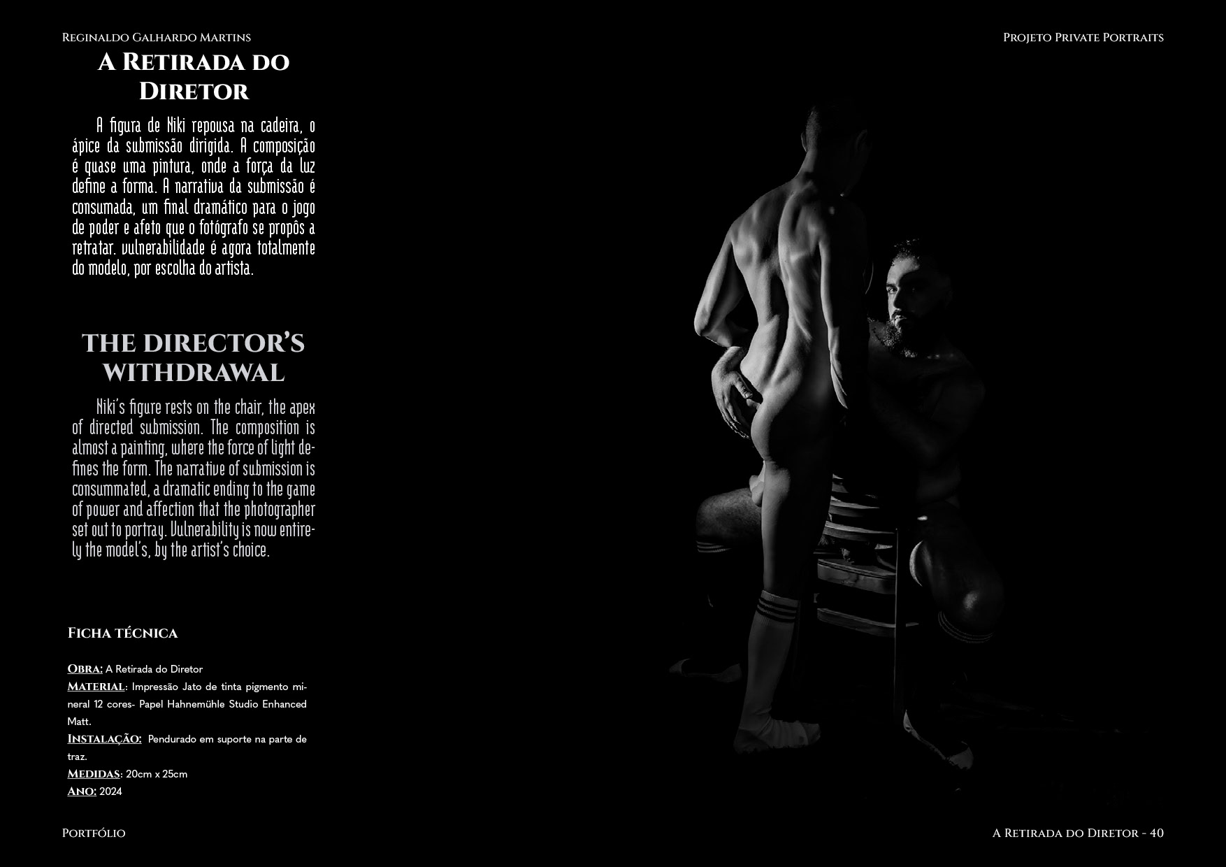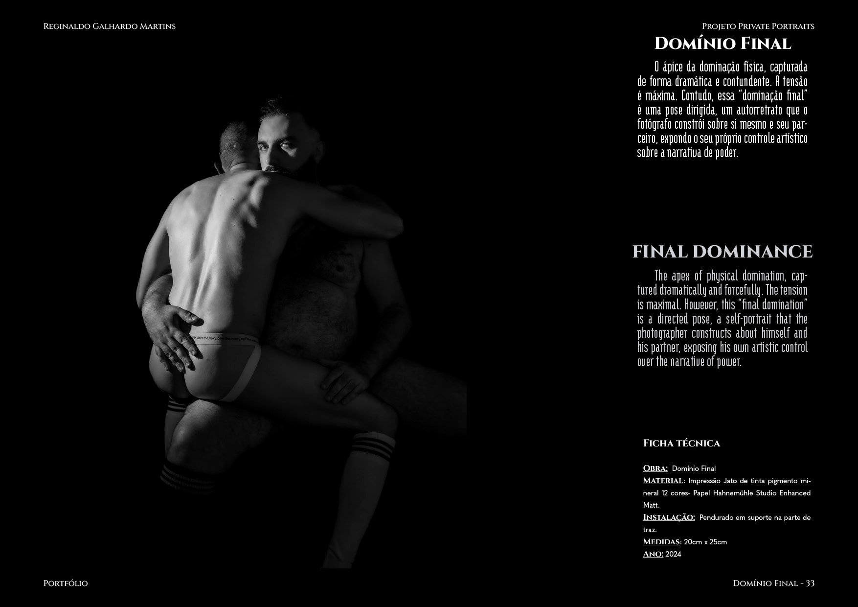 Nesta série, como fotógrafo e modelo, transformo o ato fotográfico em escultura viva. Em 18 imagens em preto e branco, dois corpos se encontram, entrelaçam-se e repousam como se fossem talhados em mármore — figuras masculinas que evocam o vigor e a delicadeza das estátuas gregas. Cada pose é um instante congelado, um gesto que oscila entre tensão e repouso, domínio e entrega, num diálogo silencioso de forças equilibradas.