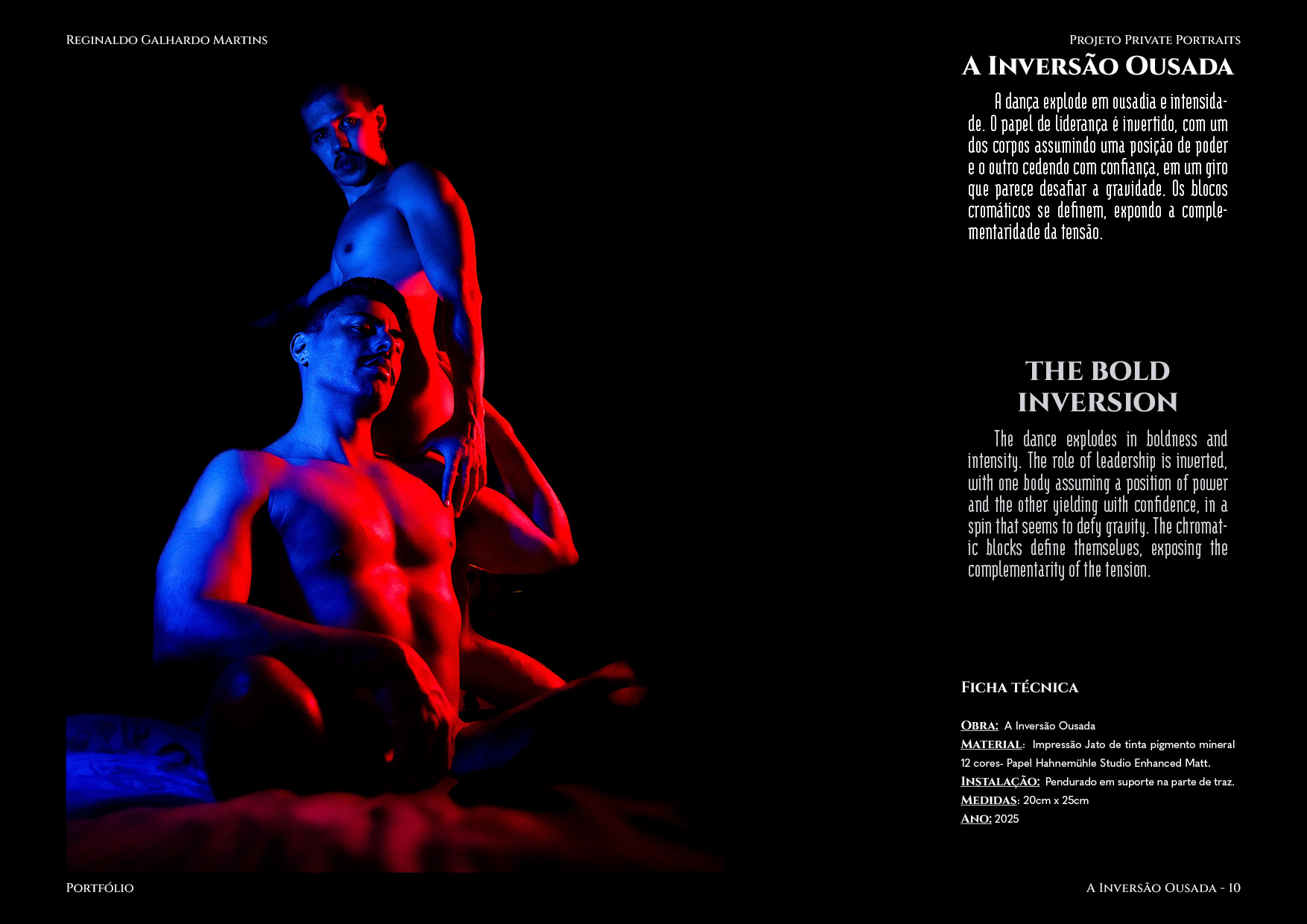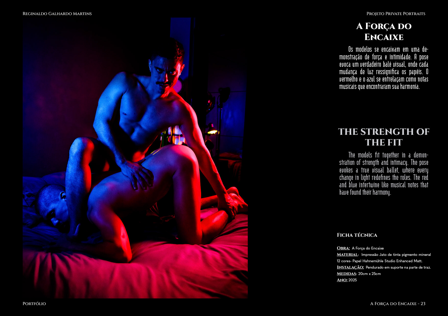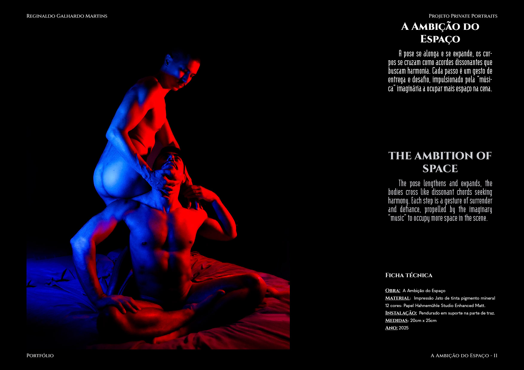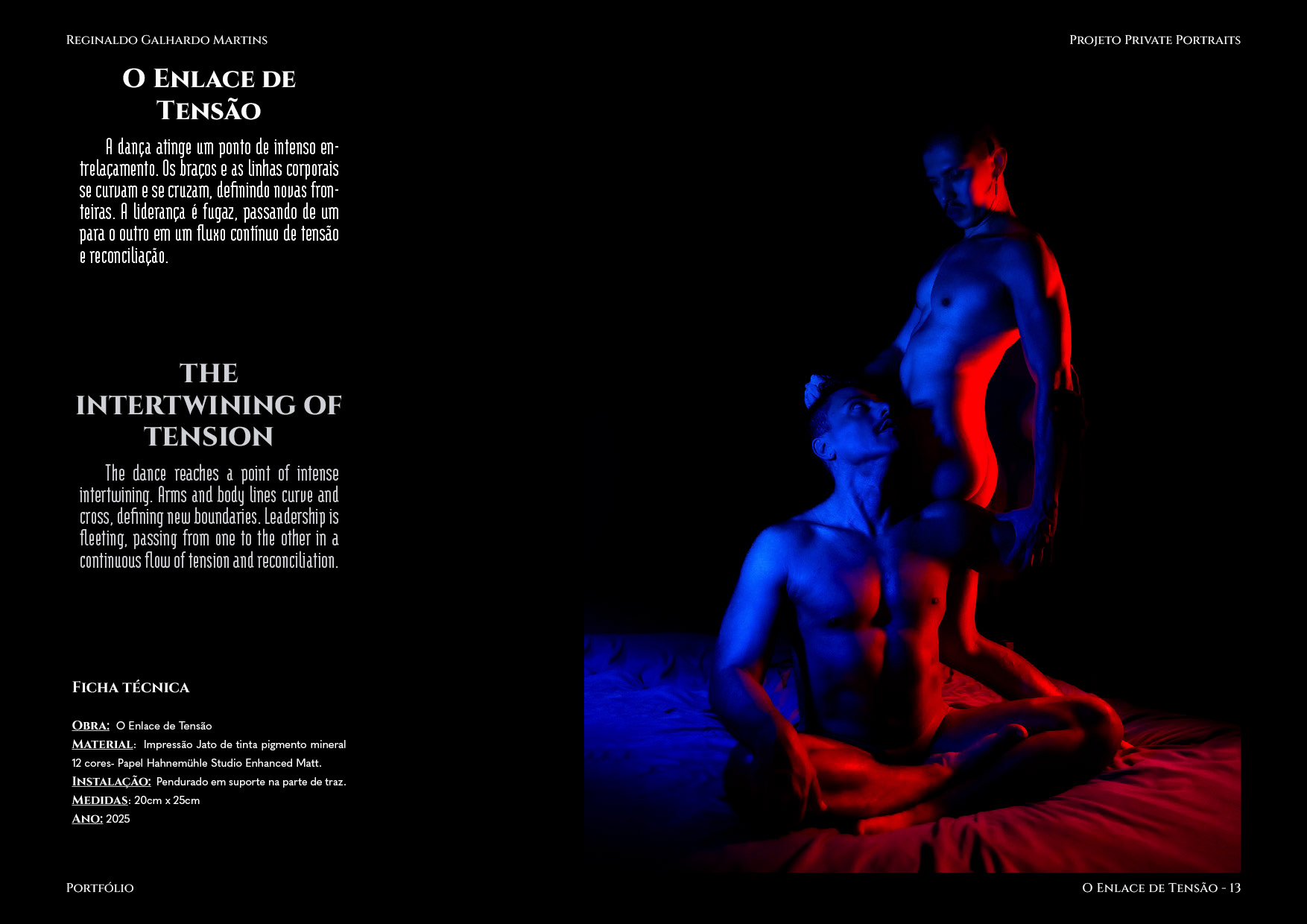 Nesta série de 20 imagens, dois corpos são coreografados sob uma iluminação dramática de contrastes intensos — o azul e o vermelho se entrelaçam como notas musicais dissonantes que buscam harmonia. O ensaio é construído não apenas como um ensaio, mas um verdadeiro balé visual, em que cada pose evoca um ato de entrega ou liderança, e cada mudança de luz ressignifica o papel de quem conduz e de quem se deixa conduzir.
