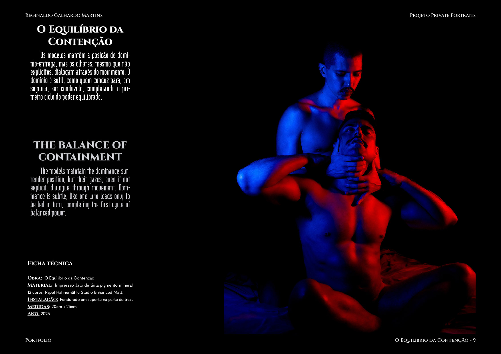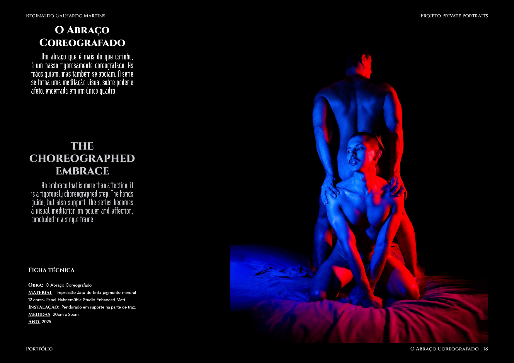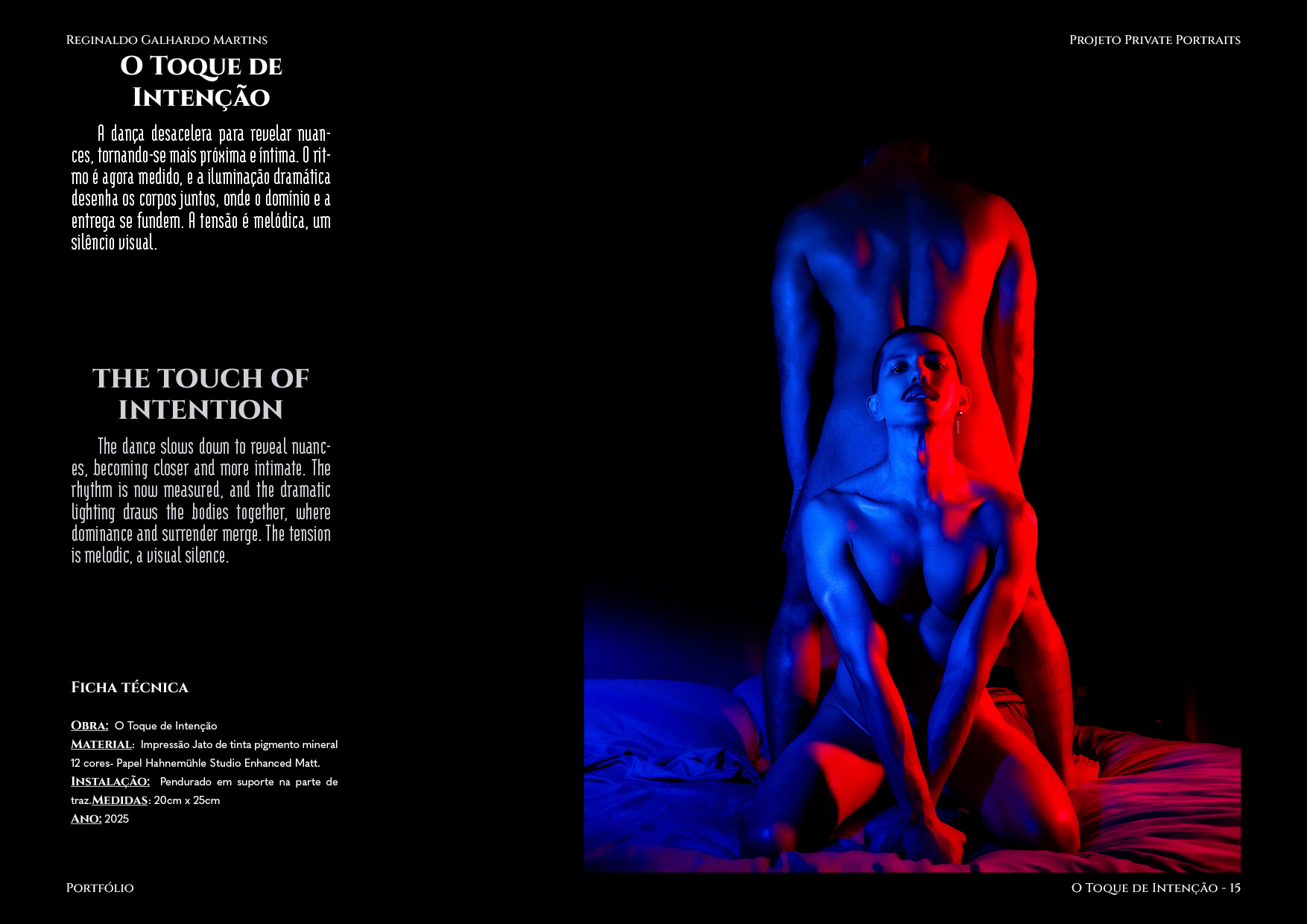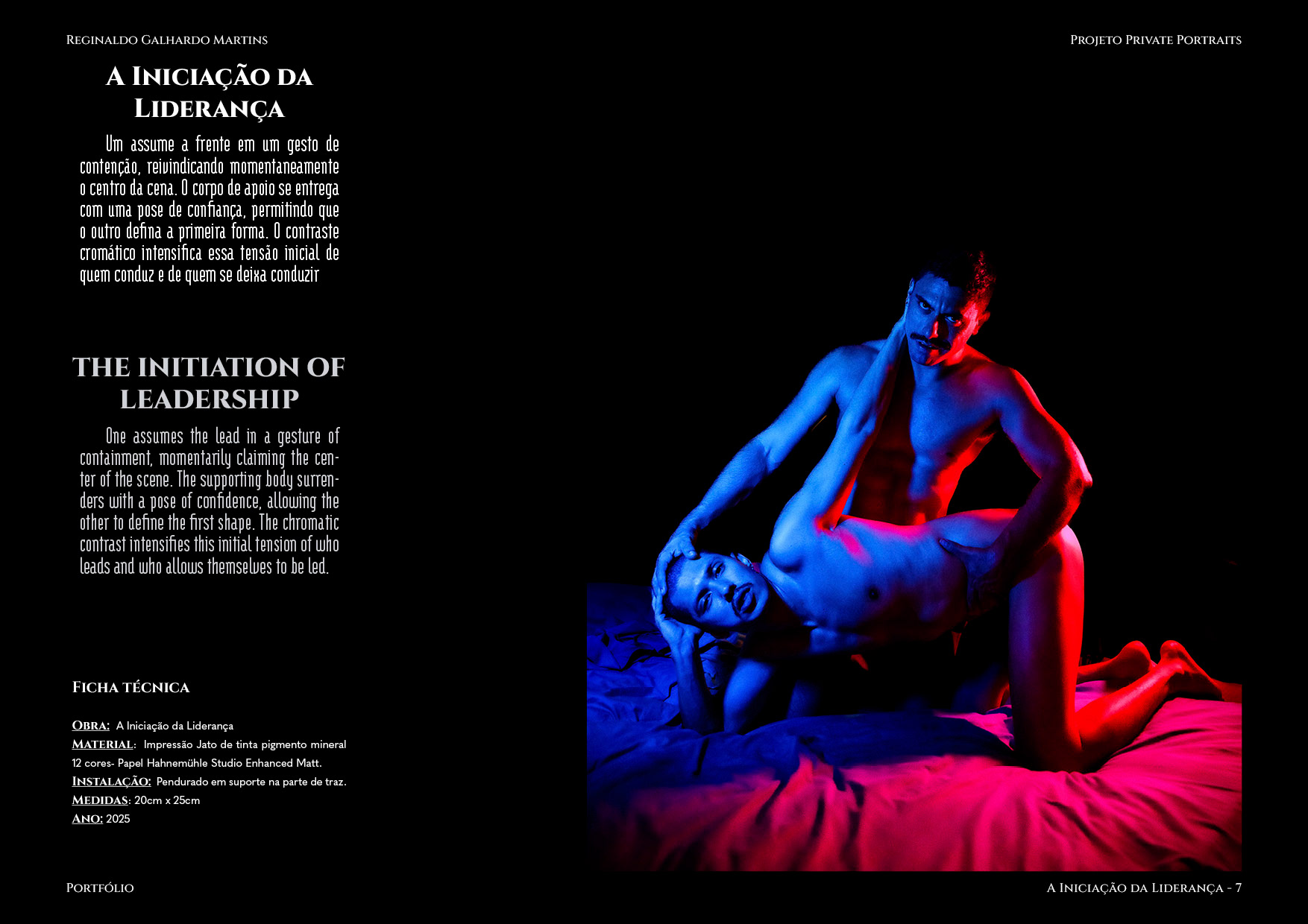 Nesta série de 20 imagens, dois corpos são coreografados sob uma iluminação dramática de contrastes intensos — o azul e o vermelho se entrelaçam como notas musicais dissonantes que buscam harmonia. O ensaio é construído não apenas como um ensaio, mas um verdadeiro balé visual, em que cada pose evoca um ato de entrega ou liderança, e cada mudança de luz ressignifica o papel de quem conduz e de quem se deixa conduzir.