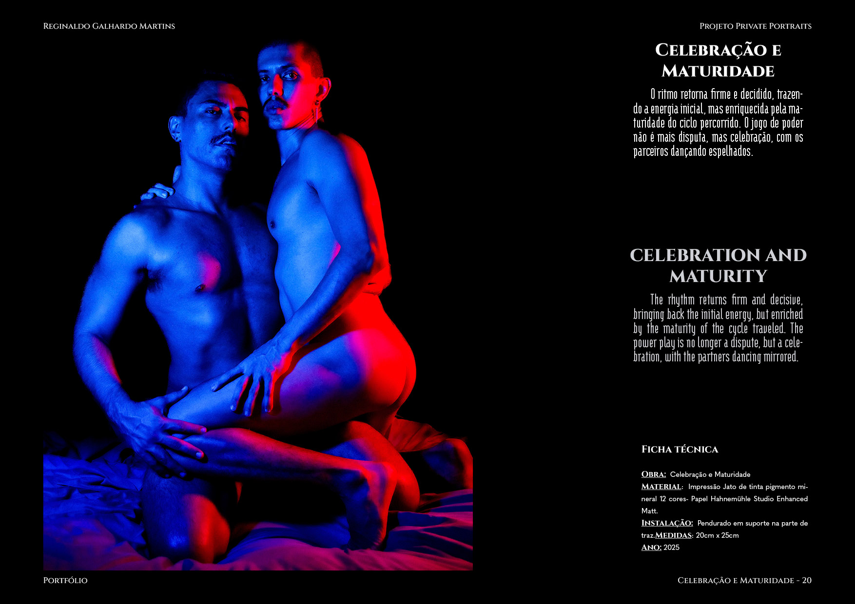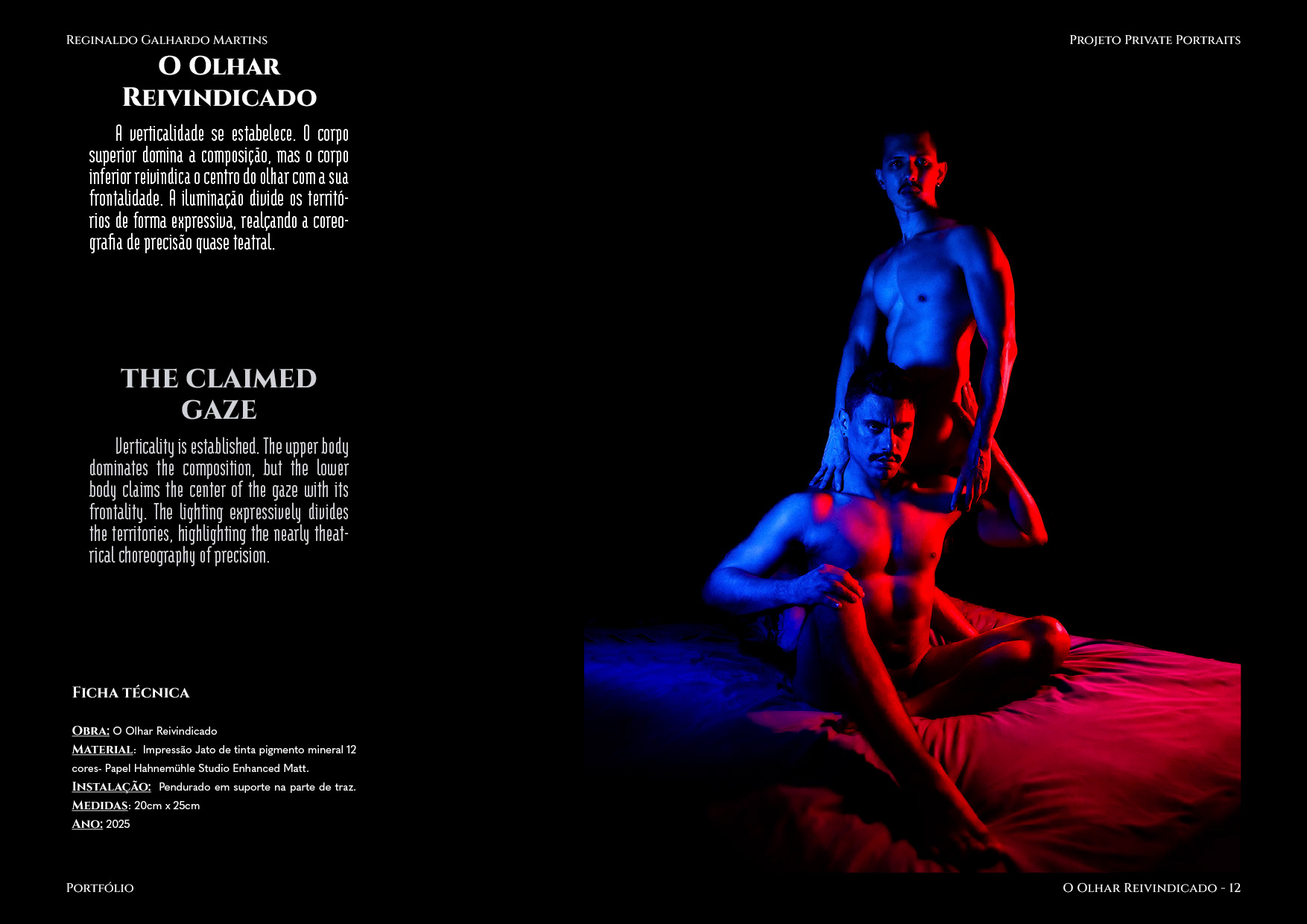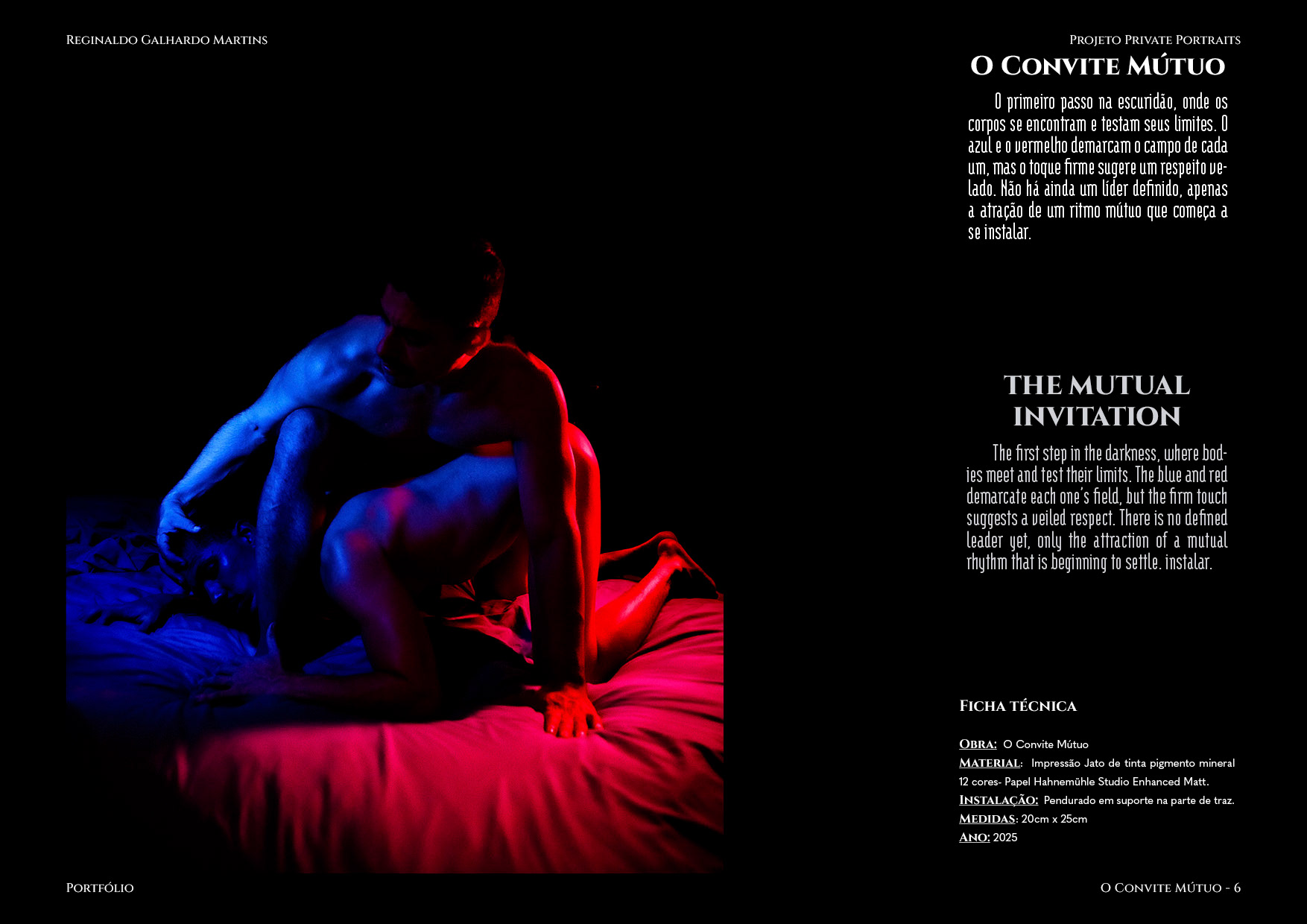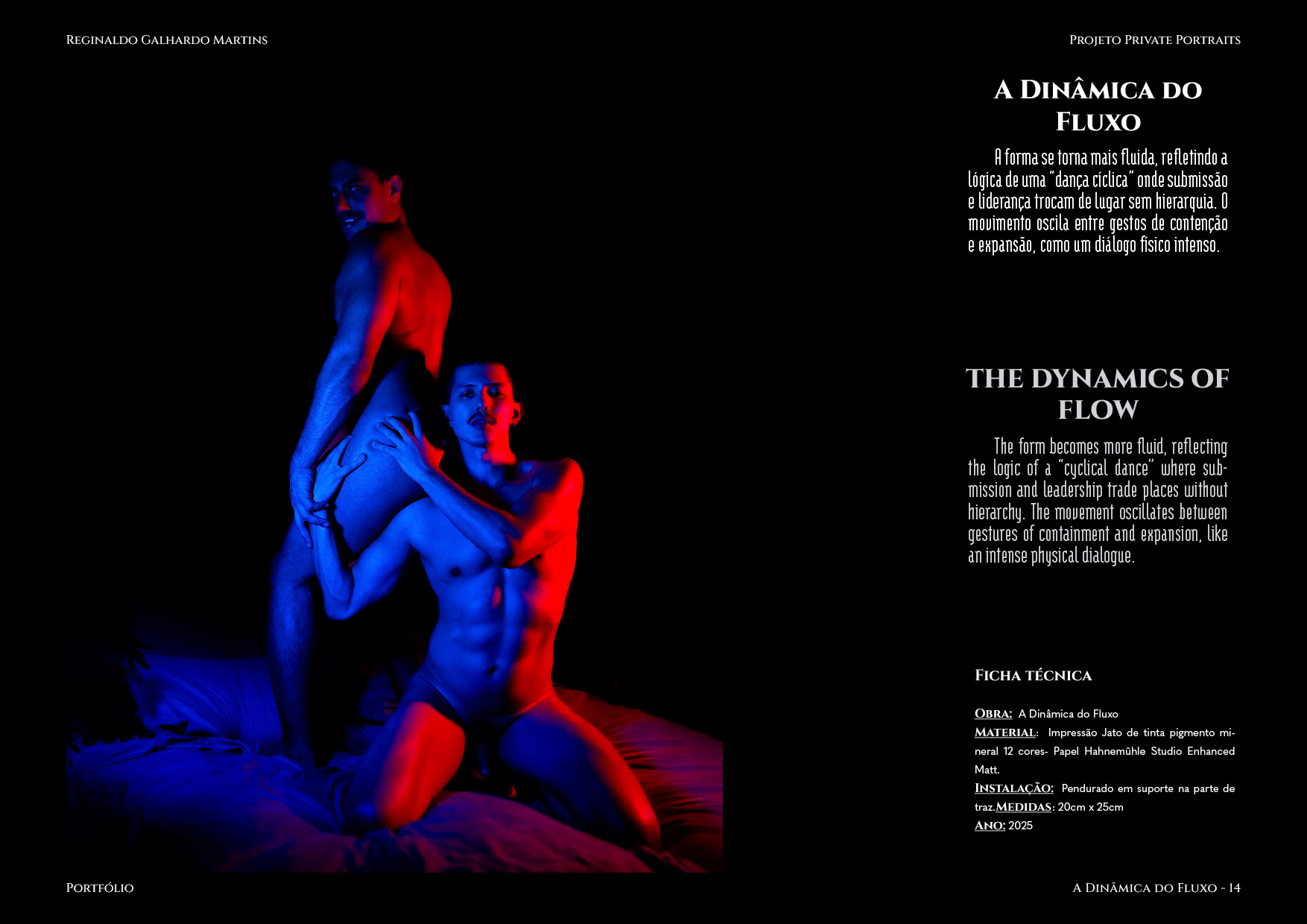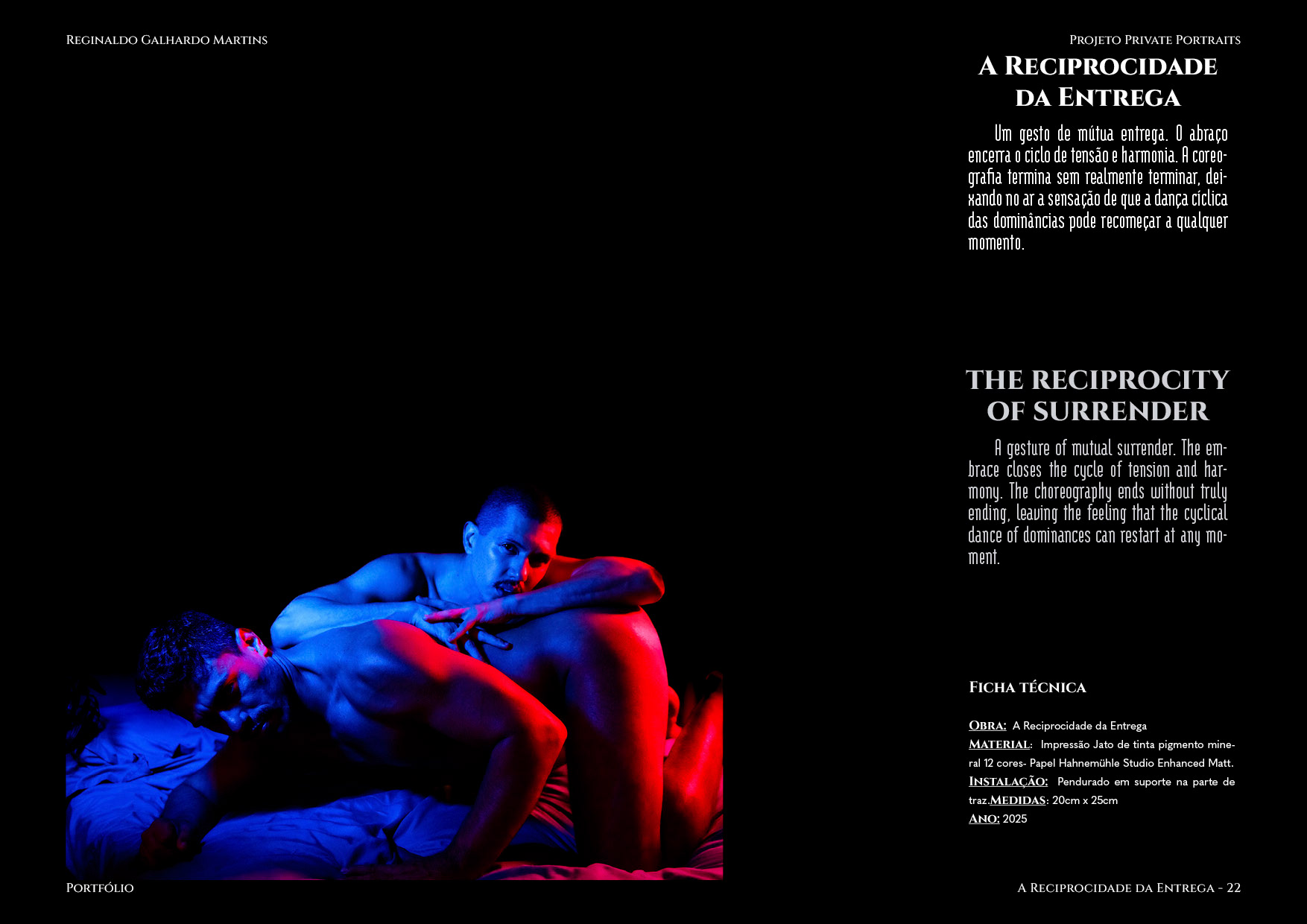 Nesta série de 20 imagens, dois corpos são coreografados sob uma iluminação dramática de contrastes intensos — o azul e o vermelho se entrelaçam como notas musicais dissonantes que buscam harmonia. O ensaio é construído não apenas como um ensaio, mas um verdadeiro balé visual, em que cada pose evoca um ato de entrega ou liderança, e cada mudança de luz ressignifica o papel de quem conduz e de quem se deixa conduzir.