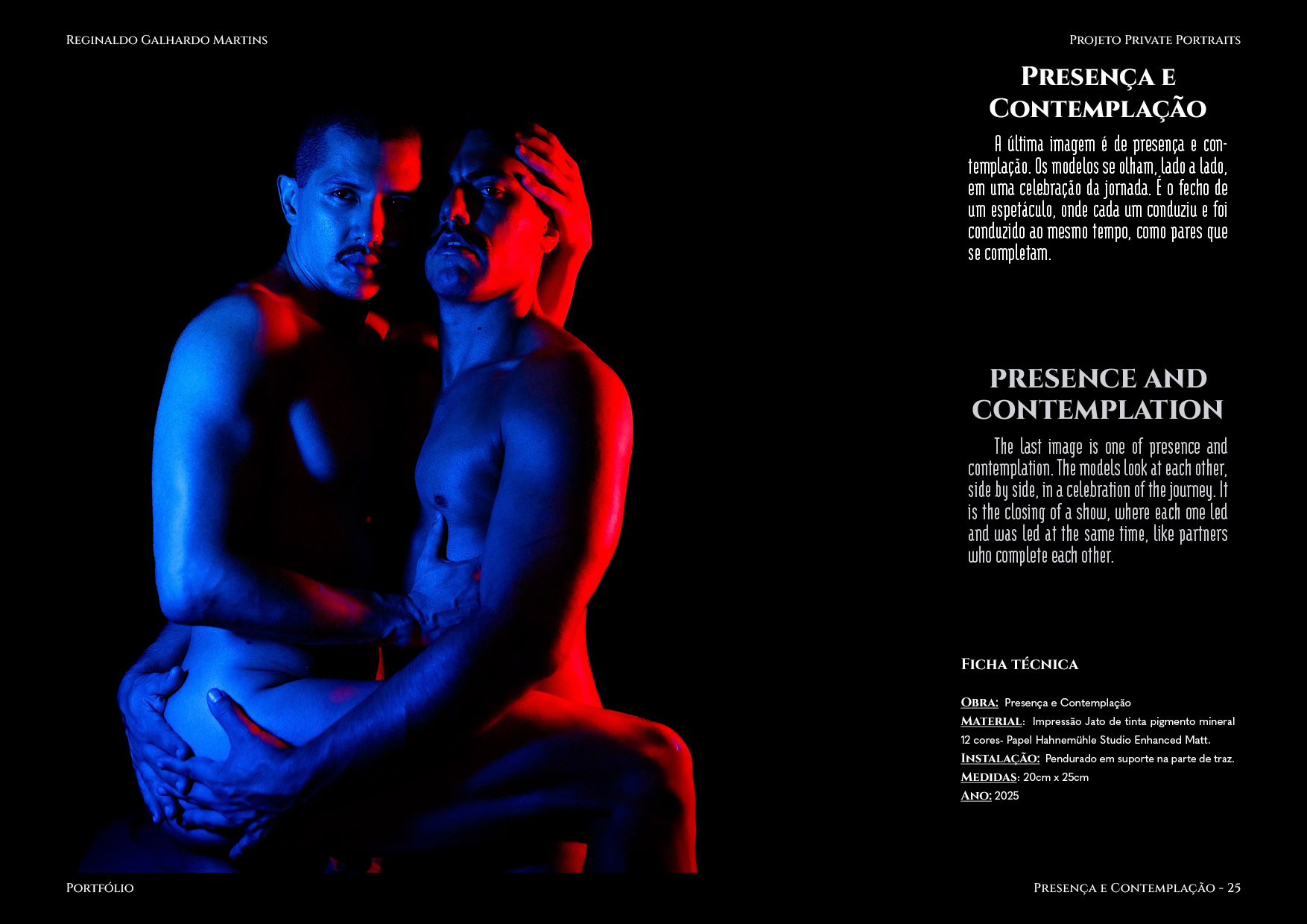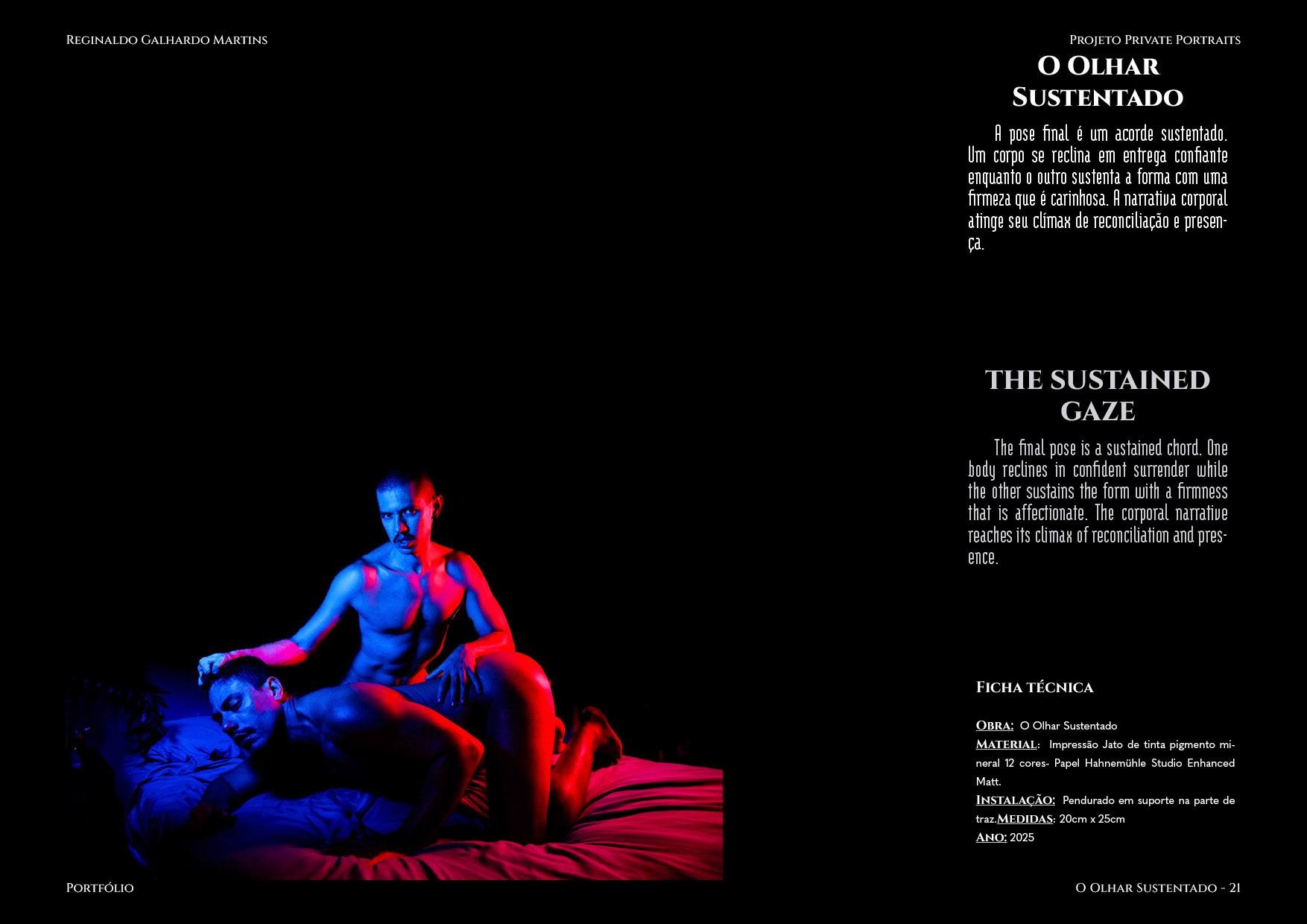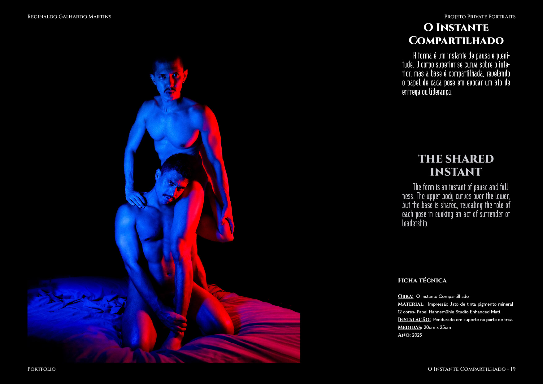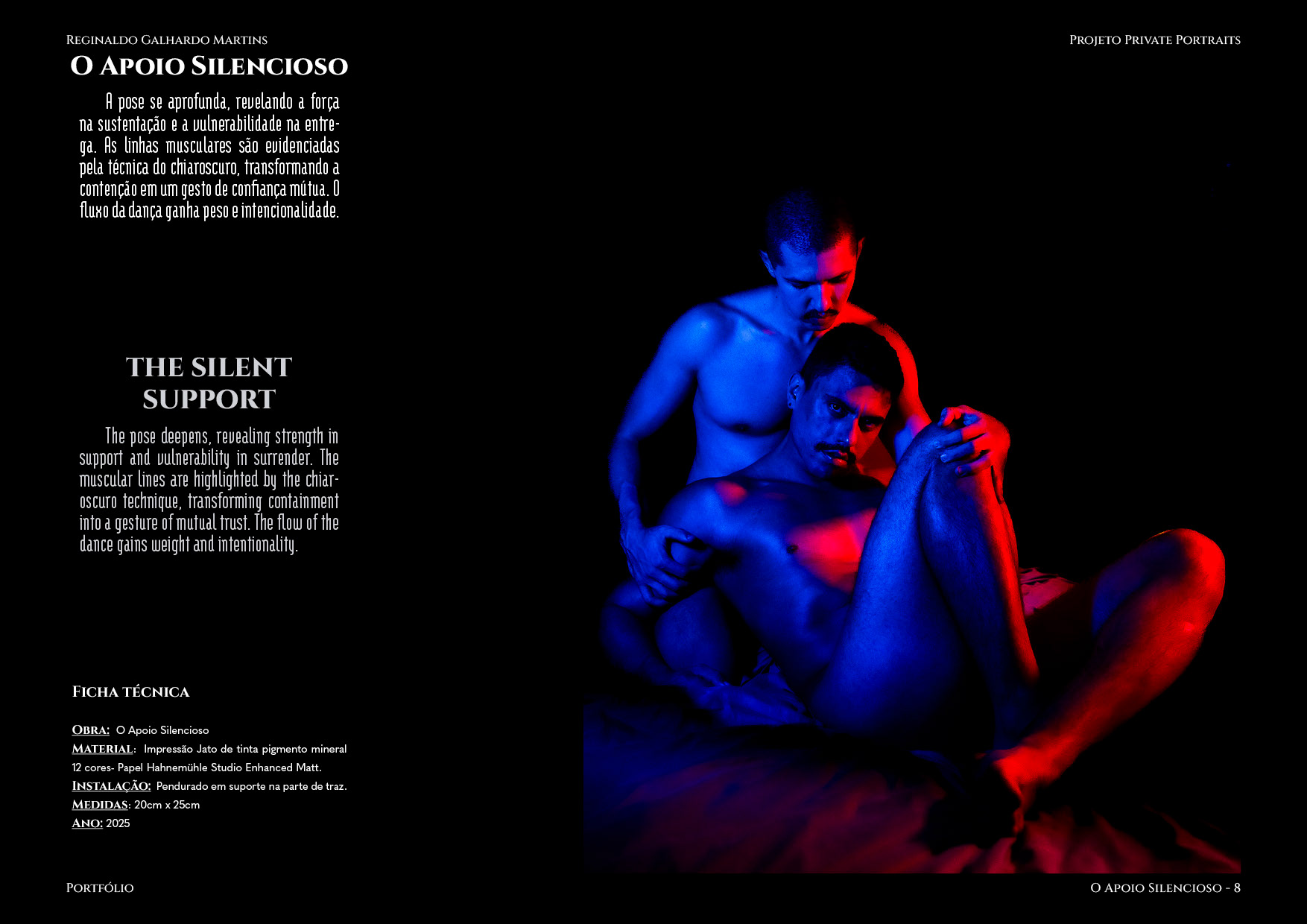 Nesta série de 20 imagens, dois corpos são coreografados sob uma iluminação dramática de contrastes intensos — o azul e o vermelho se entrelaçam como notas musicais dissonantes que buscam harmonia. O ensaio é construído não apenas como um ensaio, mas um verdadeiro balé visual, em que cada pose evoca um ato de entrega ou liderança, e cada mudança de luz ressignifica o papel de quem conduz e de quem se deixa conduzir.